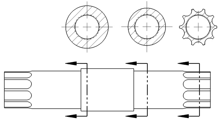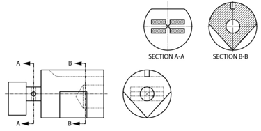 Half section: The quarter of the part is cut through two perpendicular planes passing through the center is removed, the remainder is called a half section. And it is used for symmetrical objects.