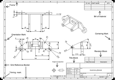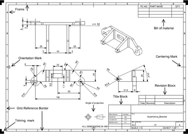 Grid reference border: it is used to divide the drawing sheet into zones, to easy identification of drawing views or details for large drawing sheets. The top and bottom horizontal direction is marked with numbers, and vertical direction left and right sides are marked with alphabets as shown in above image.